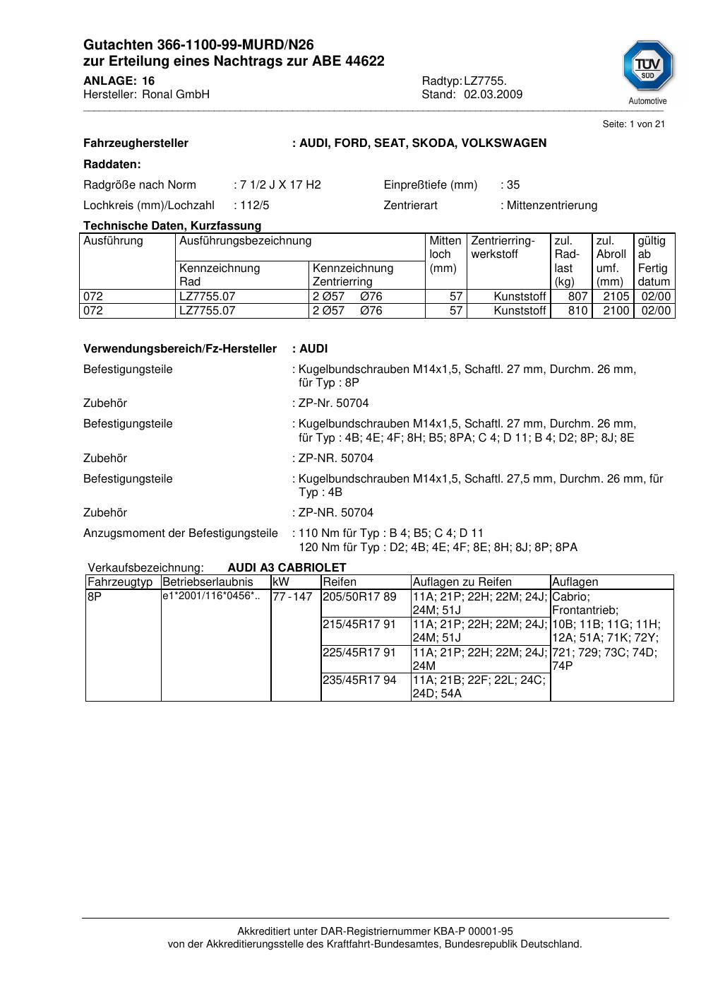 Dieses Gutachten (abe) bezieht sich auf die Alufelge brand-ronal LZ7755 in der Ausführung 2Jx17 ET 0, Mittenloch 0 mm (KBA 44622). Im PDF findest du typischerweise zulässige Reifengrößen, Auflagen/Anbauhinweise und – je nach Dokument – Hinweise zur Eintragung.