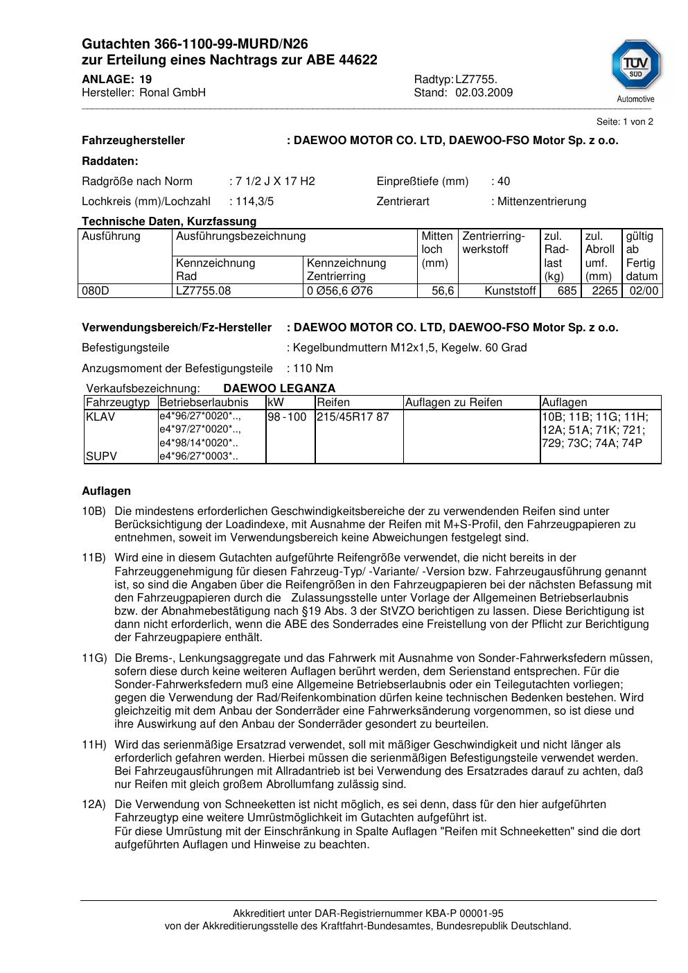 Dieses Gutachten (abe) bezieht sich auf die Alufelge brand-ronal LZ7755 in der Ausführung 2Jx17 ET 0, Mittenloch 0 mm (KBA 44622). Im PDF findest du typischerweise zulässige Reifengrößen, Auflagen/Anbauhinweise und – je nach Dokument – Hinweise zur Eintragung.