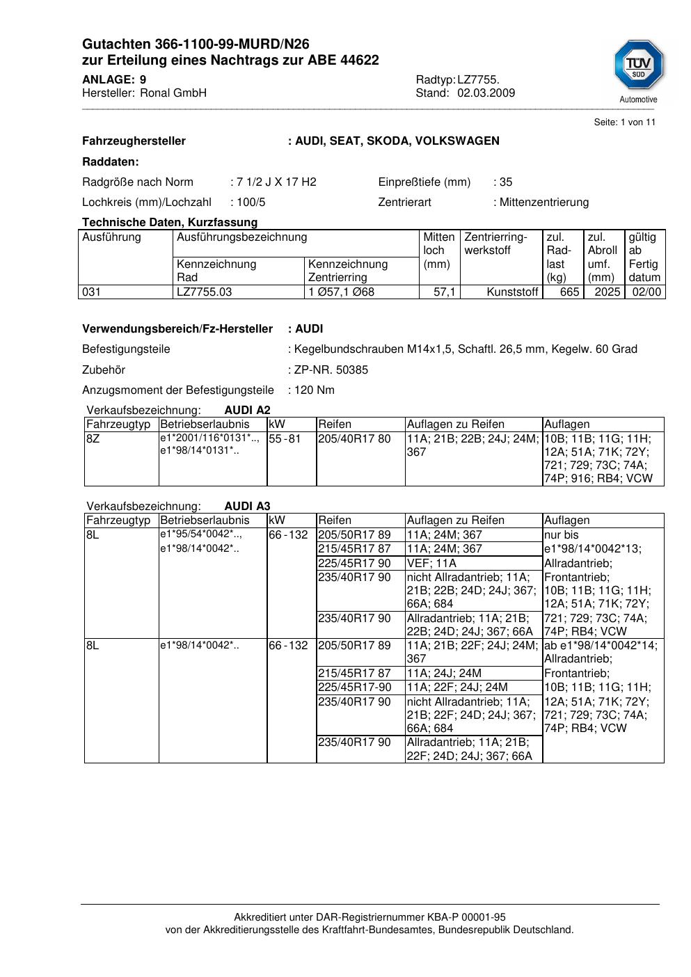Dieses Gutachten (abe) bezieht sich auf die Alufelge Ronal LZ7755 in der Ausführung 2Jx17 ET 0, Mittenloch 0 mm (KBA 44622). Im PDF findest du typischerweise zulässige Reifengrößen, Auflagen/Anbauhinweise und – je nach Dokument – Hinweise zur Eintragung.