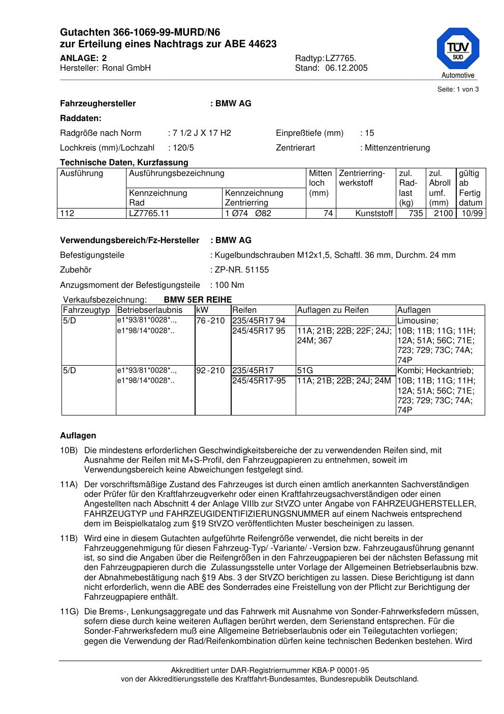 Dieses Gutachten (abe) bezieht sich auf die Alufelge Ronal LZ7765 in der Ausführung 2Jx17 ET 0, Mittenloch 0 mm (KBA 44623). Im PDF findest du typischerweise zulässige Reifengrößen, Auflagen/Anbauhinweise und – je nach Dokument – Hinweise zur Eintragung.