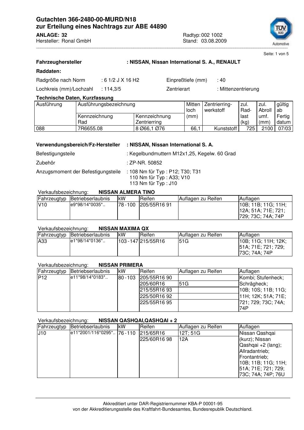 Dieses Gutachten (abe) bezieht sich auf die Alufelge Ronal 002 1002 in der Ausführung 2Jx16 ET 0, Mittenloch 0 mm (KBA 44890). Im PDF findest du typischerweise zulässige Reifengrößen, Auflagen/Anbauhinweise und – je nach Dokument – Hinweise zur Eintragung.