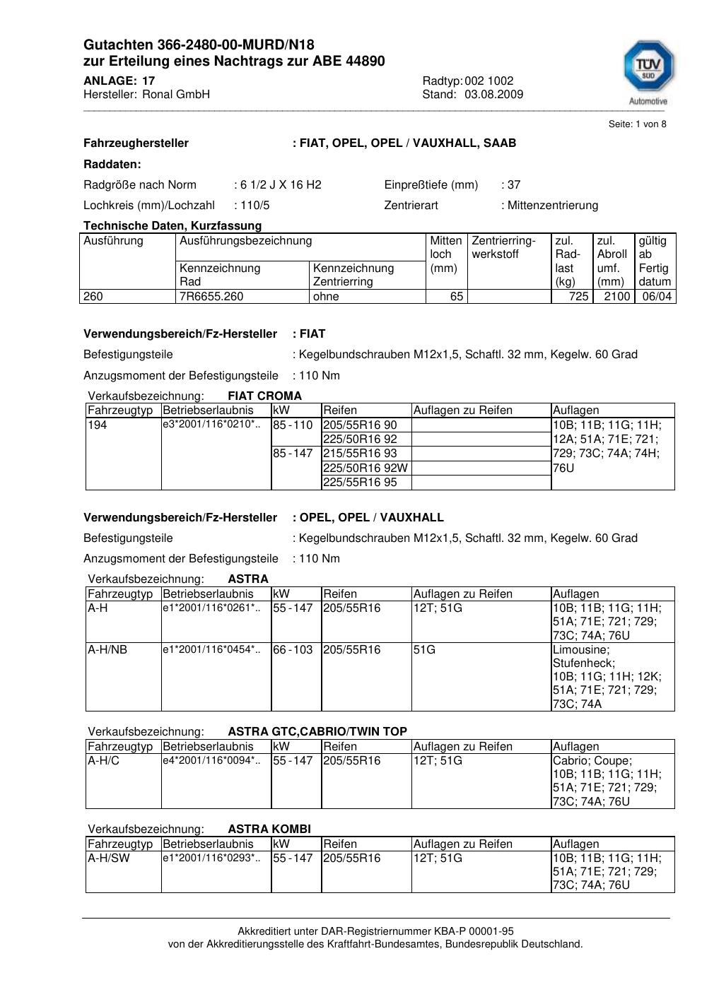 Dieses Gutachten (abe) bezieht sich auf die Alufelge Ronal 002 1002 in der Ausführung 2Jx16 ET 0, Mittenloch 0 mm (KBA 44890). Im PDF findest du typischerweise zulässige Reifengrößen, Auflagen/Anbauhinweise und – je nach Dokument – Hinweise zur Eintragung.