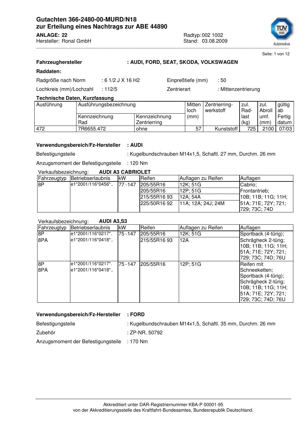 Dieses Gutachten (abe) bezieht sich auf die Alufelge Ronal 002 1002 in der Ausführung 2Jx16 ET 0, Mittenloch 0 mm (KBA 44890). Im PDF findest du typischerweise zulässige Reifengrößen, Auflagen/Anbauhinweise und – je nach Dokument – Hinweise zur Eintragung.