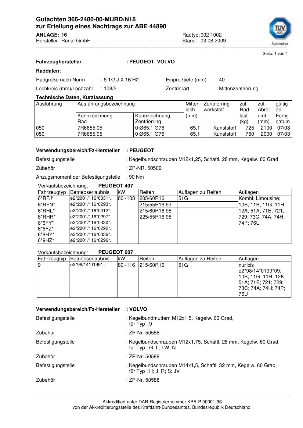 Dieses Gutachten (abe) bezieht sich auf die Alufelge Ronal 002 1002 in der Ausführung 2Jx16 ET 0, Mittenloch 0 mm (KBA 44890). Im PDF findest du typischerweise zulässige Reifengrößen, Auflagen/Anbauhinweise und – je nach Dokument – Hinweise zur Eintragung.