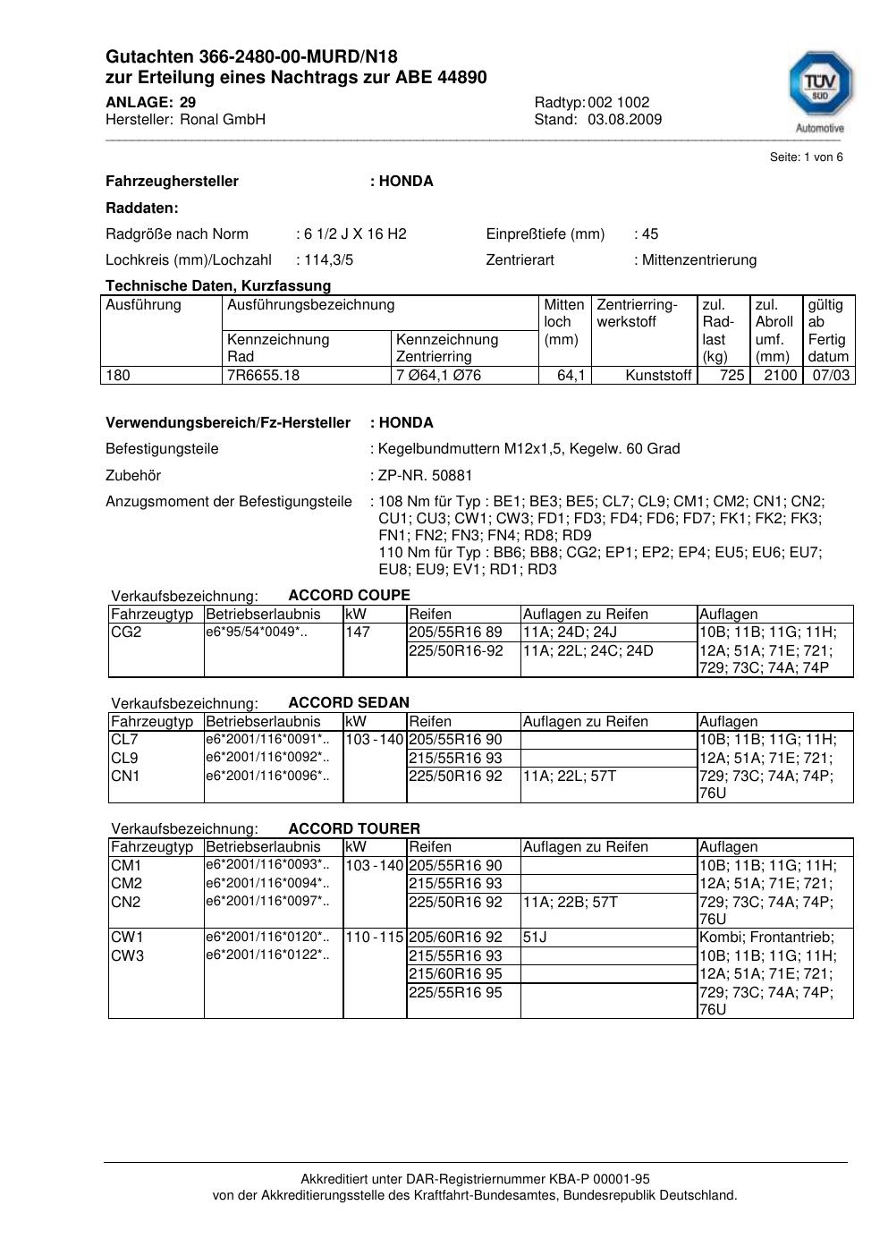 Dieses Gutachten (abe) bezieht sich auf die Alufelge Ronal 002 1002 in der Ausführung 2Jx16 ET 0, Mittenloch 0 mm (KBA 44890). Im PDF findest du typischerweise zulässige Reifengrößen, Auflagen/Anbauhinweise und – je nach Dokument – Hinweise zur Eintragung.
