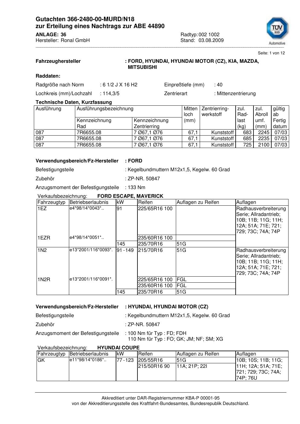 Dieses Gutachten (abe) bezieht sich auf die Alufelge Ronal 002 1002 in der Ausführung 2Jx16 ET 0, Mittenloch 0 mm (KBA 44890). Im PDF findest du typischerweise zulässige Reifengrößen, Auflagen/Anbauhinweise und – je nach Dokument – Hinweise zur Eintragung.