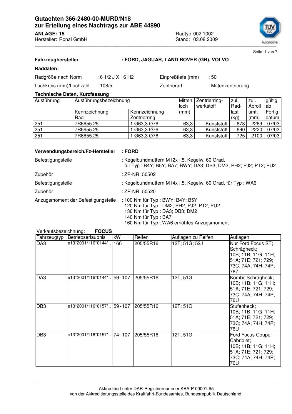 Dieses Gutachten (abe) bezieht sich auf die Alufelge Ronal 002 1002 in der Ausführung 2Jx16 ET 0, Mittenloch 0 mm (KBA 44890). Im PDF findest du typischerweise zulässige Reifengrößen, Auflagen/Anbauhinweise und – je nach Dokument – Hinweise zur Eintragung.