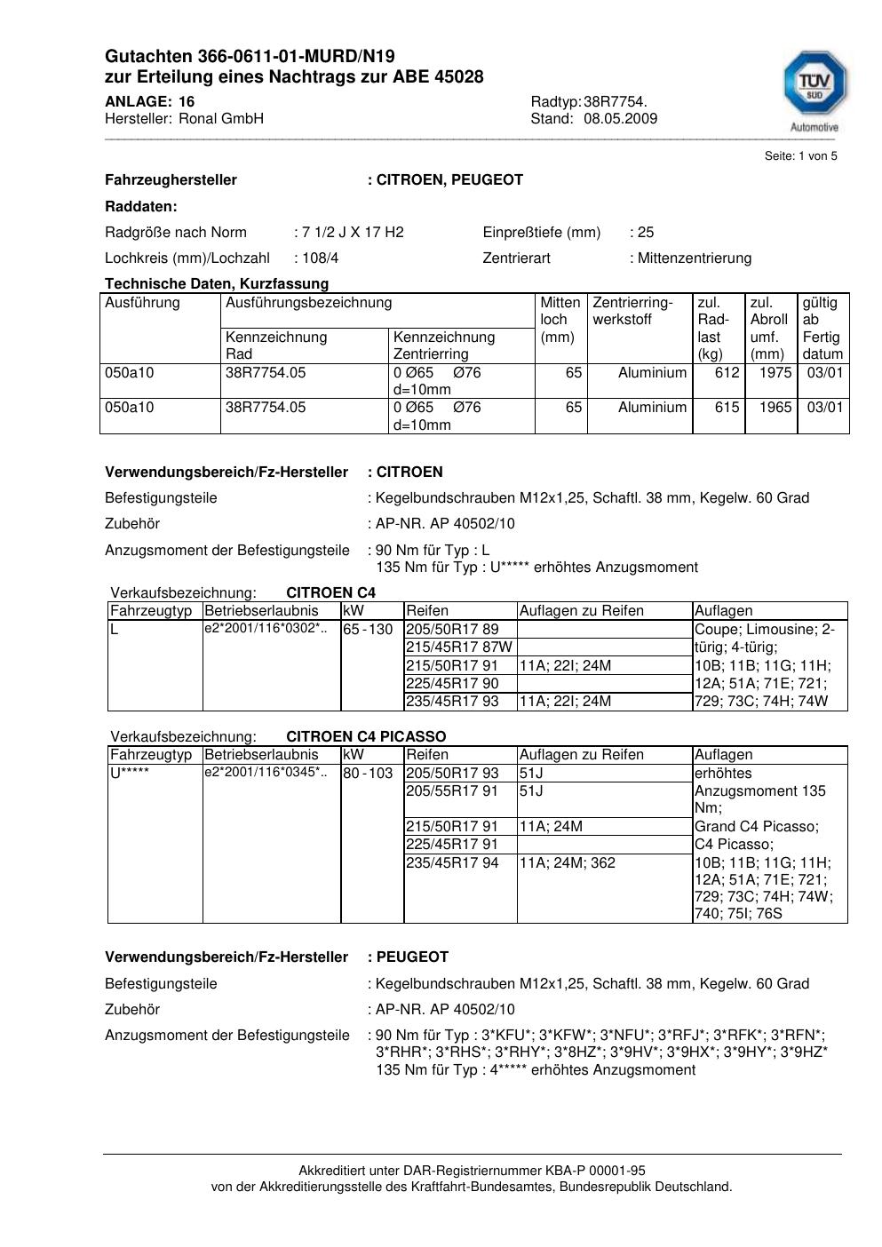 Dieses Gutachten (abe) bezieht sich auf die Alufelge brand-ronal 38R7754 in der Ausführung 2Jx17 ET 0, Mittenloch 0 mm (KBA 45028). Im PDF findest du typischerweise zulässige Reifengrößen, Auflagen/Anbauhinweise und – je nach Dokument – Hinweise zur Eintragung.