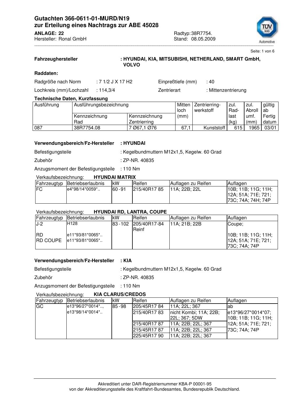 Dieses Gutachten (abe) bezieht sich auf die Alufelge Ronal 38R7754 in der Ausführung 2Jx17 ET 0, Mittenloch 0 mm (KBA 45028). Im PDF findest du typischerweise zulässige Reifengrößen, Auflagen/Anbauhinweise und – je nach Dokument – Hinweise zur Eintragung.