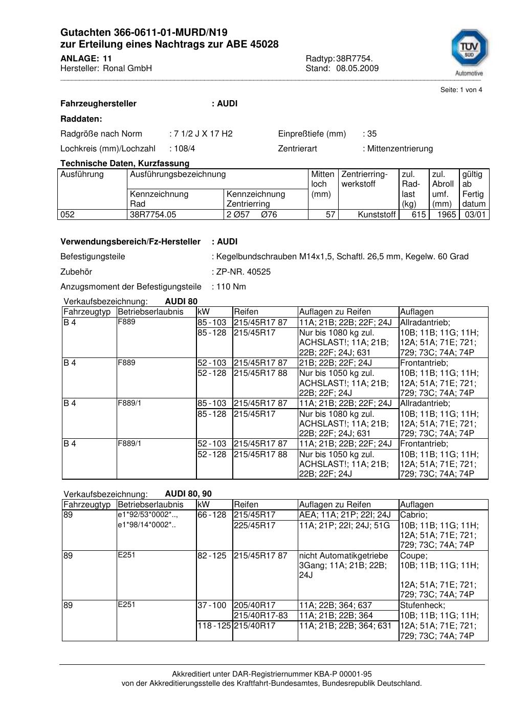 Dieses Gutachten (abe) bezieht sich auf die Alufelge Ronal 38R7754 in der Ausführung 2Jx17 ET 0, Mittenloch 0 mm (KBA 45028). Im PDF findest du typischerweise zulässige Reifengrößen, Auflagen/Anbauhinweise und – je nach Dokument – Hinweise zur Eintragung.