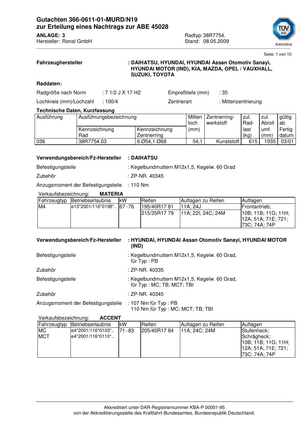 Dieses Gutachten (abe) bezieht sich auf die Alufelge Ronal 38R7754 in der Ausführung 2Jx17 ET 0, Mittenloch 0 mm (KBA 45028). Im PDF findest du typischerweise zulässige Reifengrößen, Auflagen/Anbauhinweise und – je nach Dokument – Hinweise zur Eintragung.