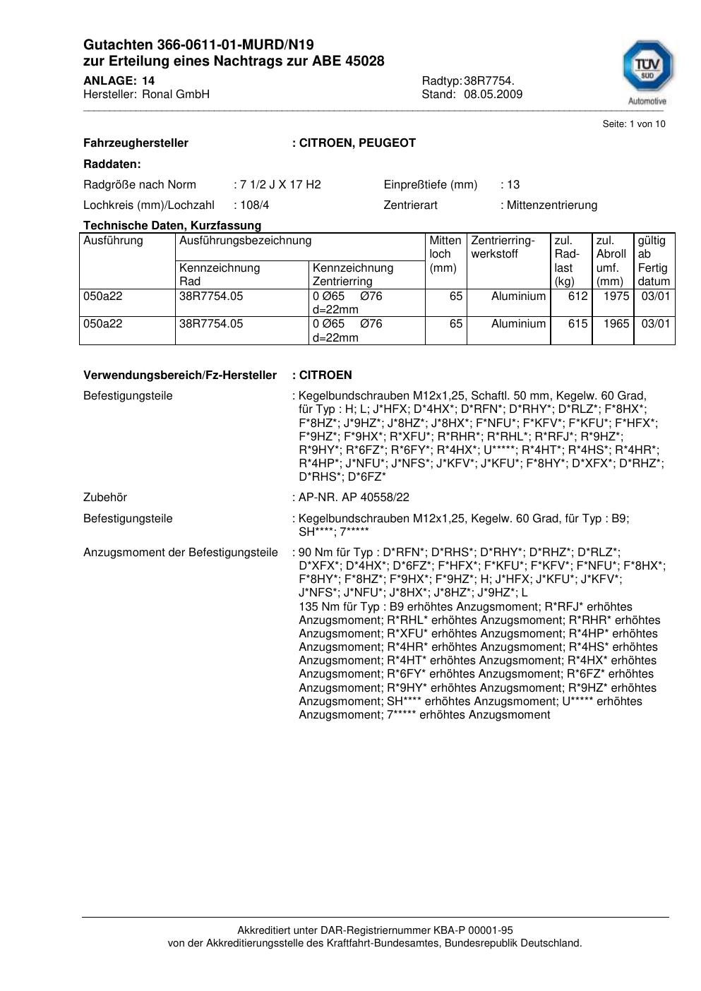 Dieses Gutachten (abe) bezieht sich auf die Alufelge brand-ronal 38R7754 in der Ausführung 2Jx17 ET 0, Mittenloch 0 mm (KBA 45028). Im PDF findest du typischerweise zulässige Reifengrößen, Auflagen/Anbauhinweise und – je nach Dokument – Hinweise zur Eintragung.