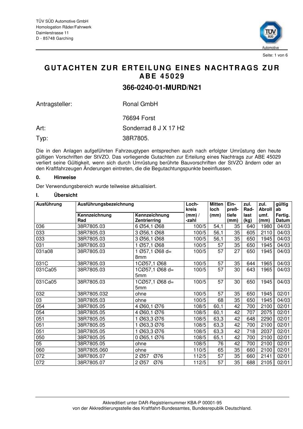 Dieses Gutachten (abe) bezieht sich auf die Alufelge ATS 38R7805 in der Ausführung 8Jx17 ET 0, Mittenloch 0 mm (KBA 45029). Im PDF findest du typischerweise zulässige Reifengrößen, Auflagen/Anbauhinweise und – je nach Dokument – Hinweise zur Eintragung.