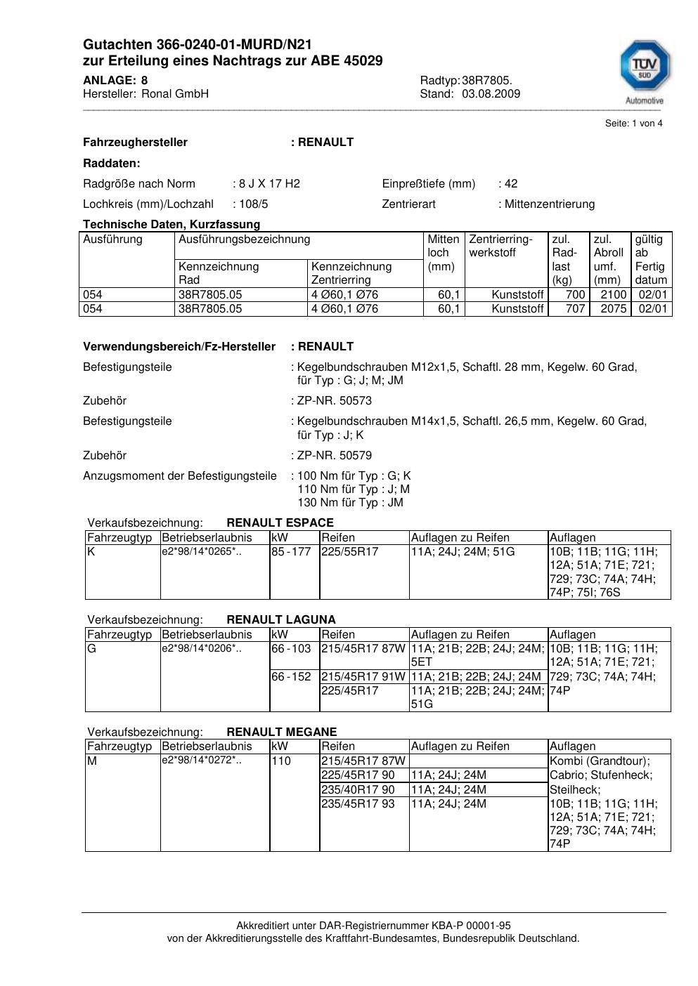 Dieses Gutachten (abe) bezieht sich auf die Alufelge Ronal 38R7805 in der Ausführung 8Jx17 ET 0, Mittenloch 0 mm (KBA 45029). Im PDF findest du typischerweise zulässige Reifengrößen, Auflagen/Anbauhinweise und – je nach Dokument – Hinweise zur Eintragung.