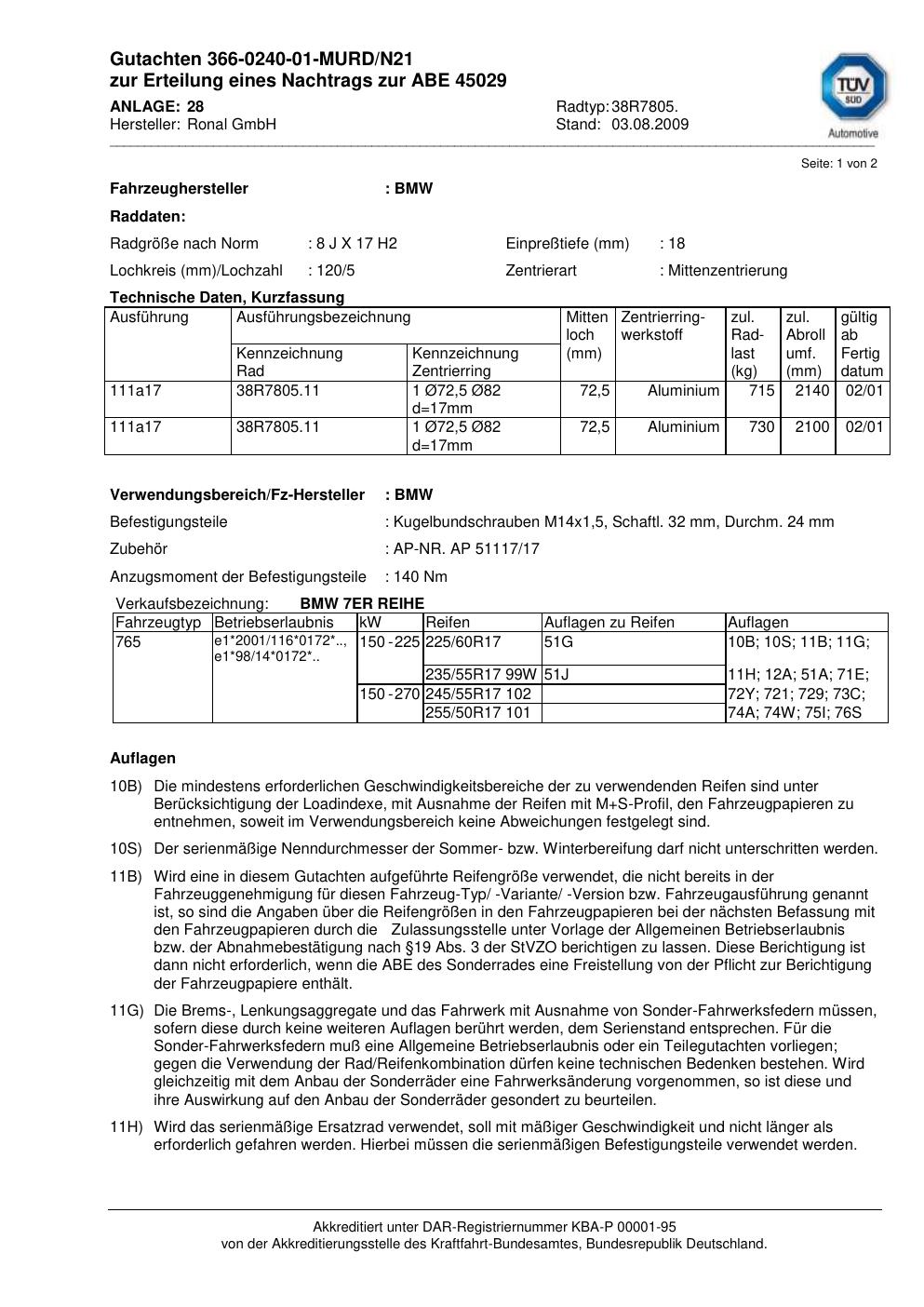 Dieses Gutachten (abe) bezieht sich auf die Alufelge brand-ronal 38R7805 in der Ausführung 8Jx17 ET 0, Mittenloch 0 mm (KBA 45029). Im PDF findest du typischerweise zulässige Reifengrößen, Auflagen/Anbauhinweise und – je nach Dokument – Hinweise zur Eintragung.