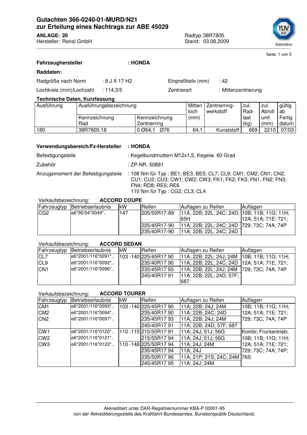 Dieses Gutachten (abe) bezieht sich auf die Alufelge Ronal 38R7805 in der Ausführung 8Jx17 ET 0, Mittenloch 0 mm (KBA 45029). Im PDF findest du typischerweise zulässige Reifengrößen, Auflagen/Anbauhinweise und – je nach Dokument – Hinweise zur Eintragung.