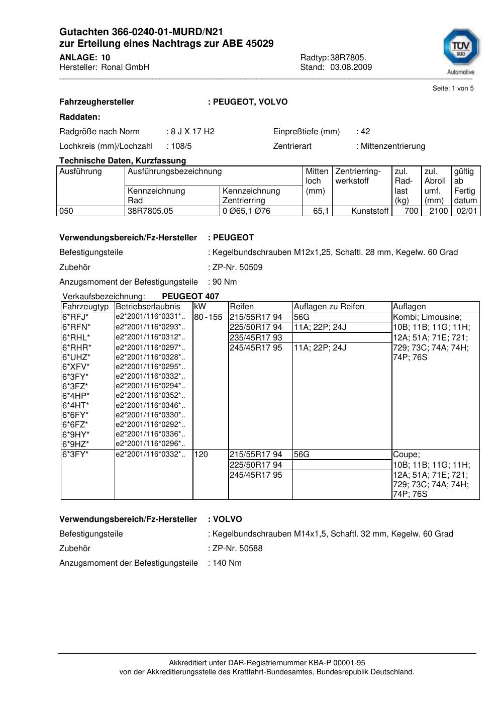 Dieses Gutachten (abe) bezieht sich auf die Alufelge Ronal 38R7805 in der Ausführung 8Jx17 ET 0, Mittenloch 0 mm (KBA 45029). Im PDF findest du typischerweise zulässige Reifengrößen, Auflagen/Anbauhinweise und – je nach Dokument – Hinweise zur Eintragung.