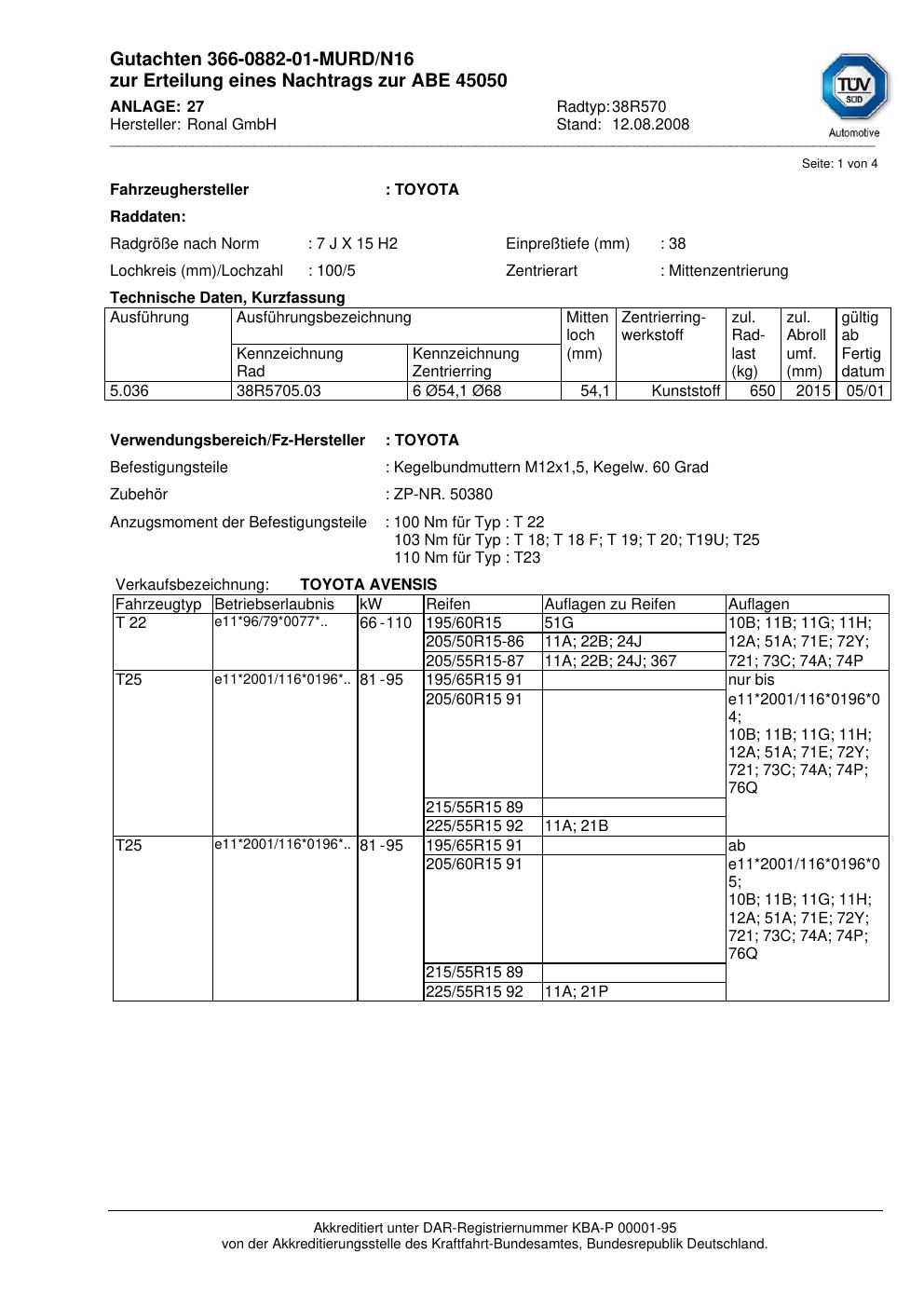 Dieses Gutachten (abe) bezieht sich auf die Alufelge Ronal 38R570 in der Ausführung 7Jx15 ET 0, Mittenloch 0 mm (KBA 45050). Im PDF findest du typischerweise zulässige Reifengrößen, Auflagen/Anbauhinweise und – je nach Dokument – Hinweise zur Eintragung.