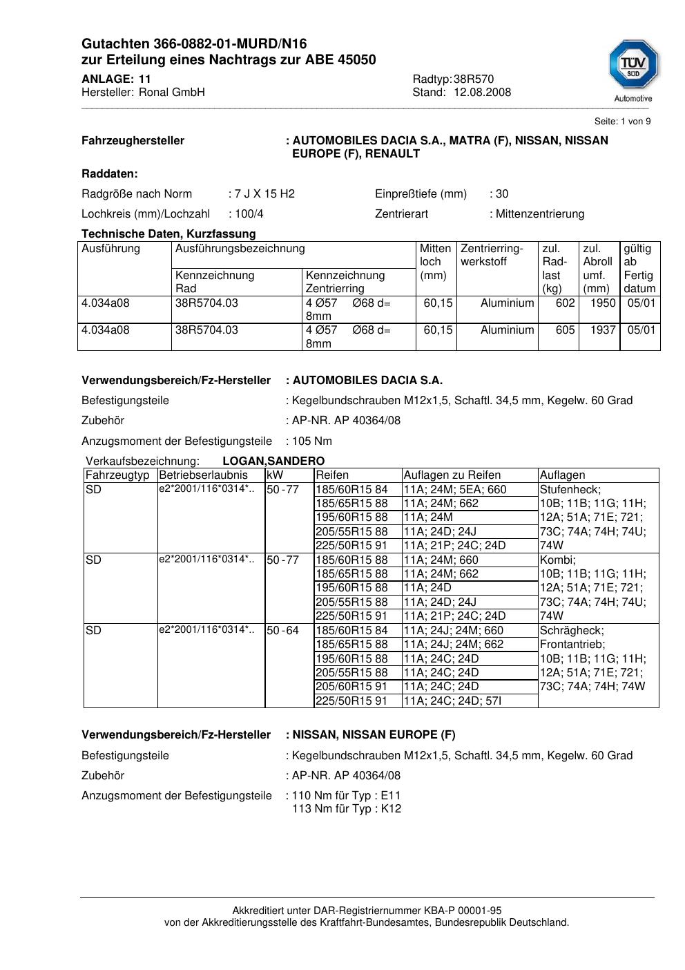 Dieses Gutachten (abe) bezieht sich auf die Alufelge brand-ronal 38R570 in der Ausführung 7Jx15 ET 0, Mittenloch 0 mm (KBA 45050). Im PDF findest du typischerweise zulässige Reifengrößen, Auflagen/Anbauhinweise und – je nach Dokument – Hinweise zur Eintragung.