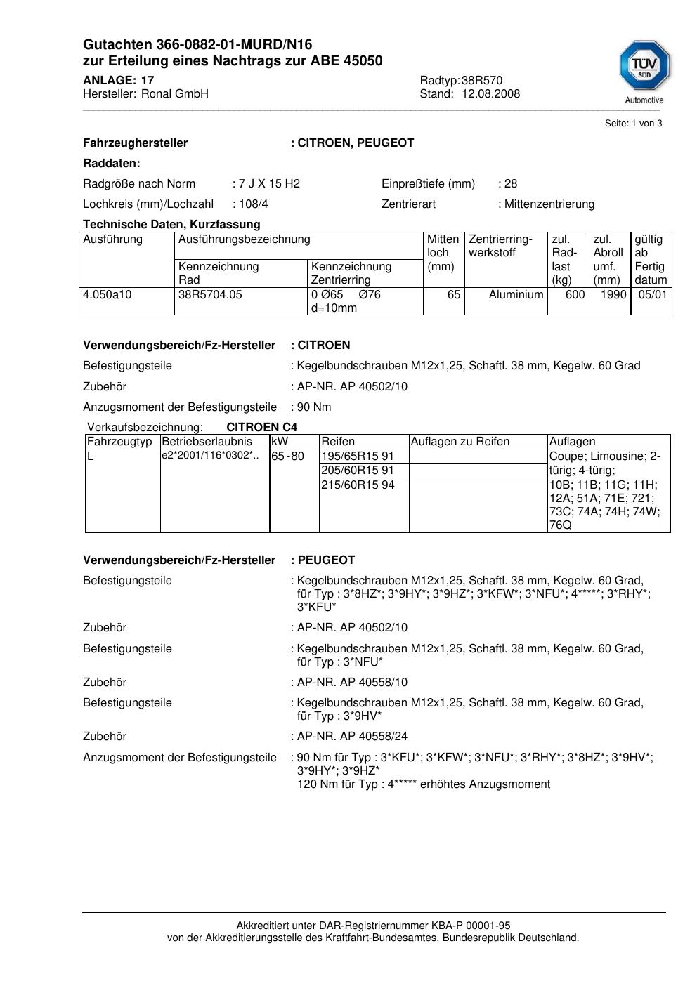 Dieses Gutachten (abe) bezieht sich auf die Alufelge brand-ronal 38R570 in der Ausführung 7Jx15 ET 0, Mittenloch 0 mm (KBA 45050). Im PDF findest du typischerweise zulässige Reifengrößen, Auflagen/Anbauhinweise und – je nach Dokument – Hinweise zur Eintragung.