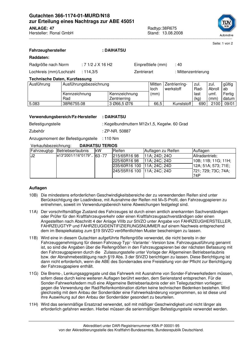 Dieses Gutachten (abe) bezieht sich auf die Alufelge Ronal 38R675 in der Ausführung 2Jx16 ET 0, Mittenloch 0 mm (KBA 45051). Im PDF findest du typischerweise zulässige Reifengrößen, Auflagen/Anbauhinweise und – je nach Dokument – Hinweise zur Eintragung.