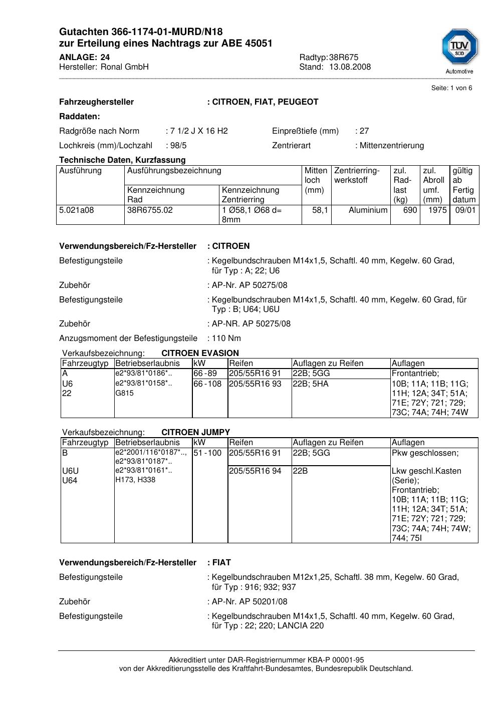 Dieses Gutachten (abe) bezieht sich auf die Alufelge brand-ronal 38R675 in der Ausführung 2Jx16 ET 0, Mittenloch 0 mm (KBA 45051). Im PDF findest du typischerweise zulässige Reifengrößen, Auflagen/Anbauhinweise und – je nach Dokument – Hinweise zur Eintragung.