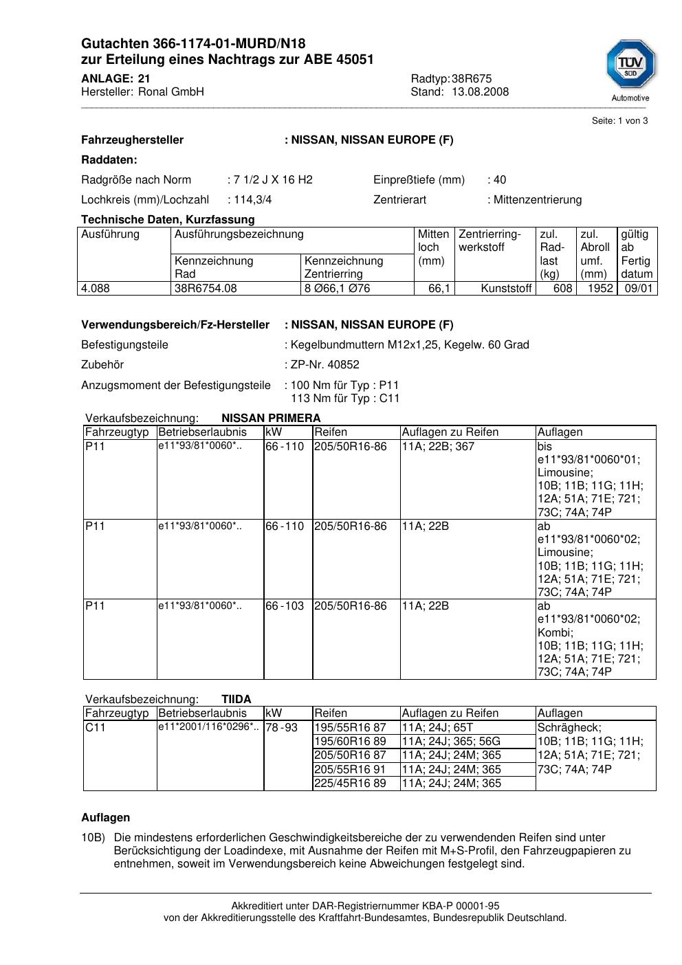 Dieses Gutachten (abe) bezieht sich auf die Alufelge Ronal 38R675 in der Ausführung 2Jx16 ET 0, Mittenloch 0 mm (KBA 45051). Im PDF findest du typischerweise zulässige Reifengrößen, Auflagen/Anbauhinweise und – je nach Dokument – Hinweise zur Eintragung.