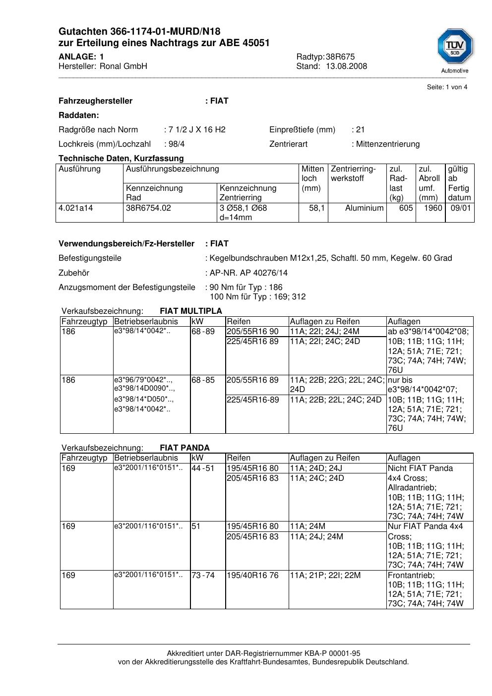 Dieses Gutachten (abe) bezieht sich auf die Alufelge brand-ronal 38R675 in der Ausführung 2Jx16 ET 0, Mittenloch 0 mm (KBA 45051). Im PDF findest du typischerweise zulässige Reifengrößen, Auflagen/Anbauhinweise und – je nach Dokument – Hinweise zur Eintragung.