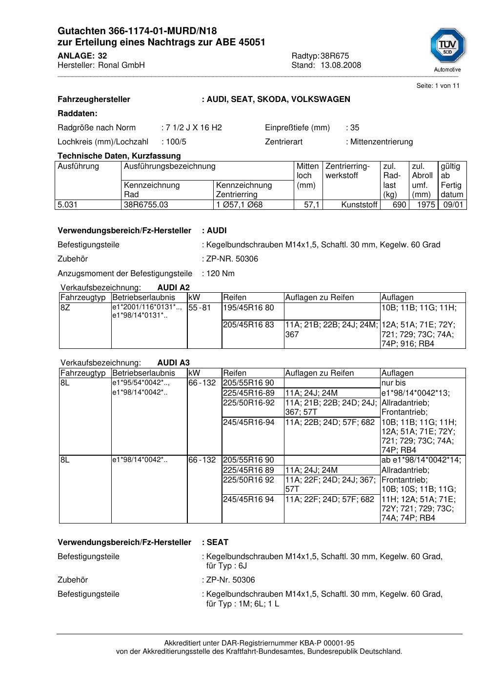 Dieses Gutachten (abe) bezieht sich auf die Alufelge Ronal 38R675 in der Ausführung 2Jx16 ET 0, Mittenloch 0 mm (KBA 45051). Im PDF findest du typischerweise zulässige Reifengrößen, Auflagen/Anbauhinweise und – je nach Dokument – Hinweise zur Eintragung.