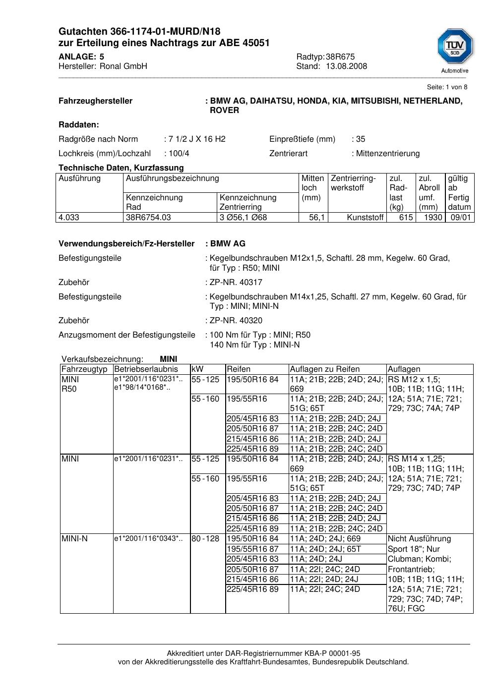 Dieses Gutachten (abe) bezieht sich auf die Alufelge Ronal 38R675 in der Ausführung 2Jx16 ET 0, Mittenloch 0 mm (KBA 45051). Im PDF findest du typischerweise zulässige Reifengrößen, Auflagen/Anbauhinweise und – je nach Dokument – Hinweise zur Eintragung.