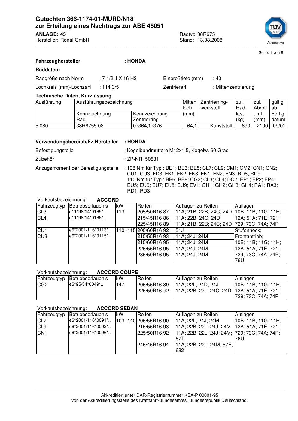Dieses Gutachten (abe) bezieht sich auf die Alufelge Ronal 38R675 in der Ausführung 2Jx16 ET 0, Mittenloch 0 mm (KBA 45051). Im PDF findest du typischerweise zulässige Reifengrößen, Auflagen/Anbauhinweise und – je nach Dokument – Hinweise zur Eintragung.