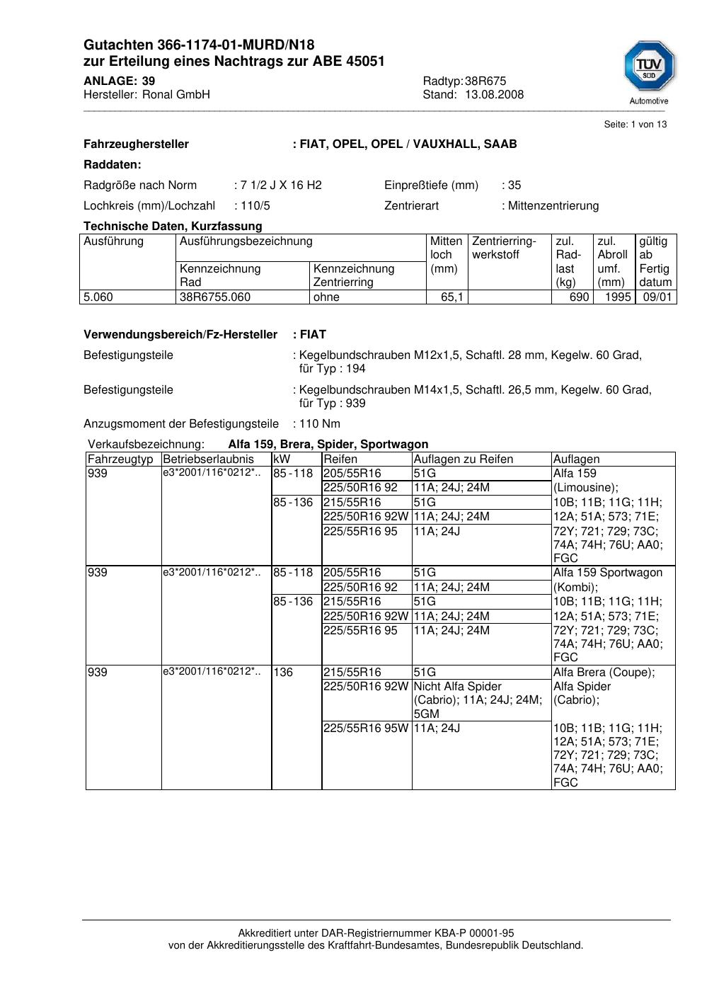 Dieses Gutachten (abe) bezieht sich auf die Alufelge Ronal 38R675 in der Ausführung 2Jx16 ET 0, Mittenloch 0 mm (KBA 45051). Im PDF findest du typischerweise zulässige Reifengrößen, Auflagen/Anbauhinweise und – je nach Dokument – Hinweise zur Eintragung.