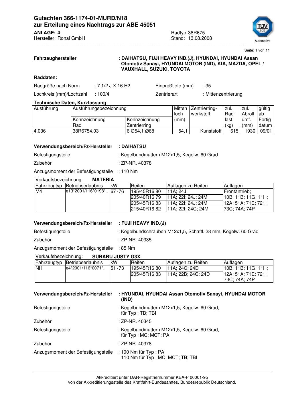 Dieses Gutachten (abe) bezieht sich auf die Alufelge Ronal 38R675 in der Ausführung 2Jx16 ET 0, Mittenloch 0 mm (KBA 45051). Im PDF findest du typischerweise zulässige Reifengrößen, Auflagen/Anbauhinweise und – je nach Dokument – Hinweise zur Eintragung.