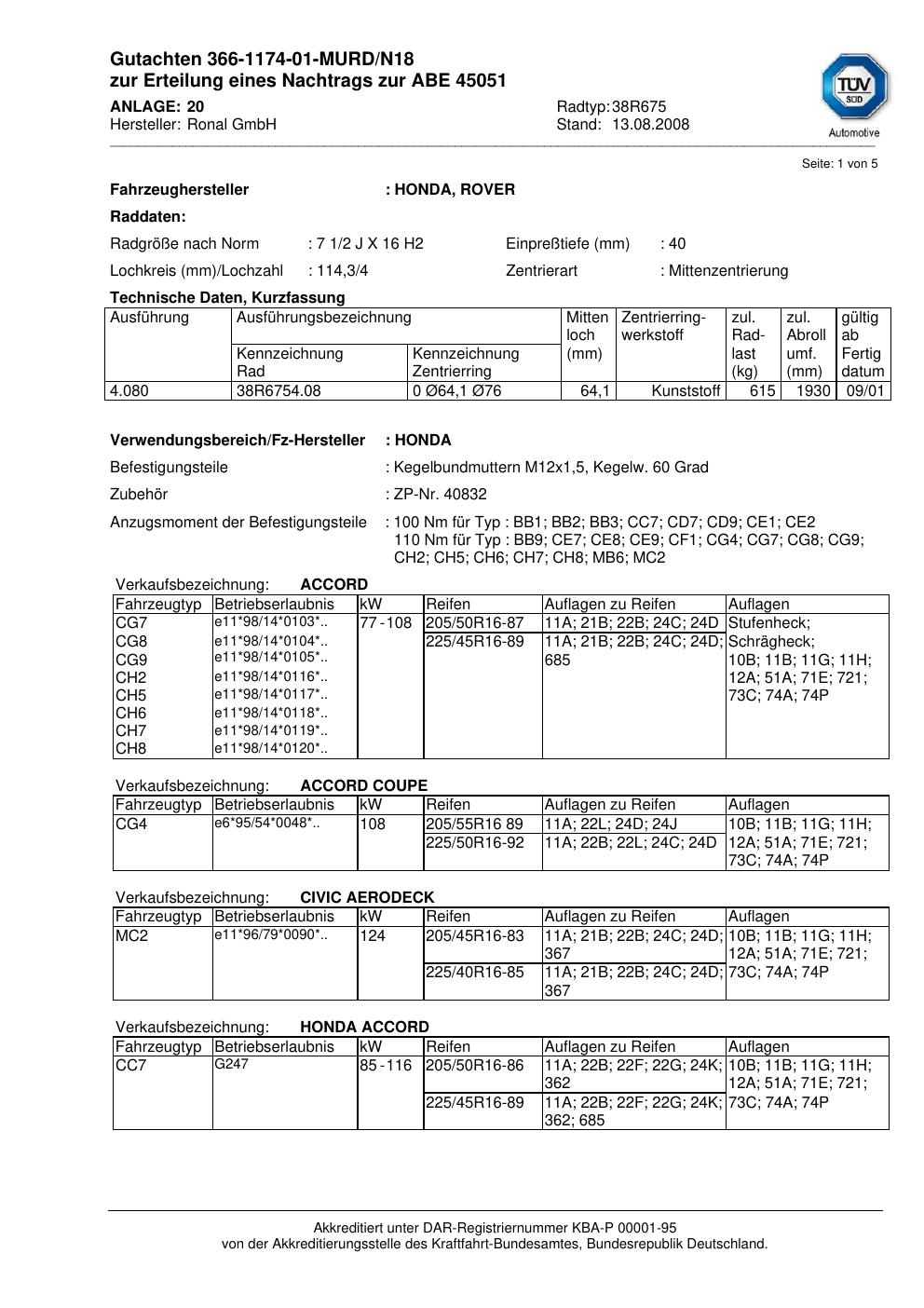 Dieses Gutachten (abe) bezieht sich auf die Alufelge Ronal 38R675 in der Ausführung 2Jx16 ET 0, Mittenloch 0 mm (KBA 45051). Im PDF findest du typischerweise zulässige Reifengrößen, Auflagen/Anbauhinweise und – je nach Dokument – Hinweise zur Eintragung.