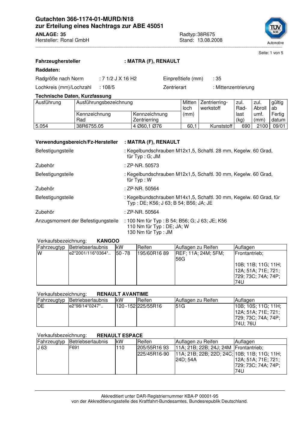 Dieses Gutachten (abe) bezieht sich auf die Alufelge Ronal 38R675 in der Ausführung 2Jx16 ET 0, Mittenloch 0 mm (KBA 45051). Im PDF findest du typischerweise zulässige Reifengrößen, Auflagen/Anbauhinweise und – je nach Dokument – Hinweise zur Eintragung.
