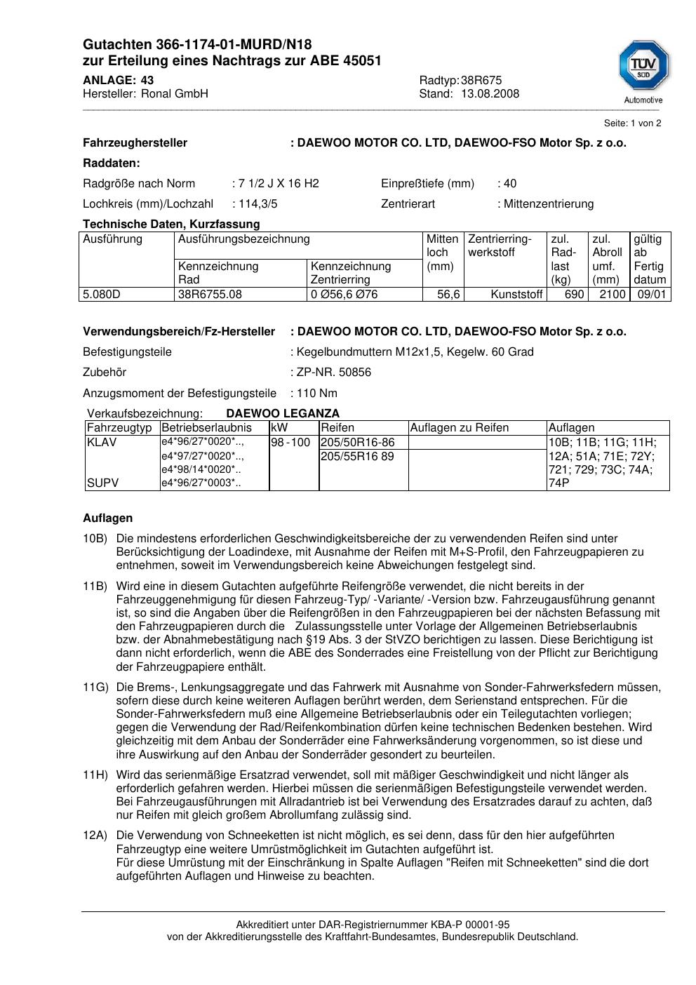Dieses Gutachten (abe) bezieht sich auf die Alufelge Ronal 38R675 in der Ausführung 2Jx16 ET 0, Mittenloch 0 mm (KBA 45051). Im PDF findest du typischerweise zulässige Reifengrößen, Auflagen/Anbauhinweise und – je nach Dokument – Hinweise zur Eintragung.