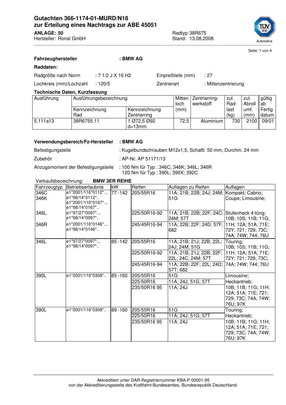 Dieses Gutachten (abe) bezieht sich auf die Alufelge brand-ronal 38R675 in der Ausführung 2Jx16 ET 0, Mittenloch 0 mm (KBA 45051). Im PDF findest du typischerweise zulässige Reifengrößen, Auflagen/Anbauhinweise und – je nach Dokument – Hinweise zur Eintragung.