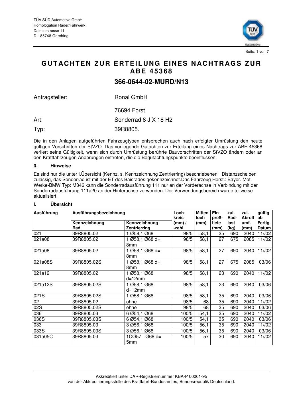 Dieses Gutachten (abe) bezieht sich auf die Alufelge ATS 39R8805 in der Ausführung 8Jx18 ET 0, Mittenloch 0 mm (KBA 45368). Im PDF findest du typischerweise zulässige Reifengrößen, Auflagen/Anbauhinweise und – je nach Dokument – Hinweise zur Eintragung.