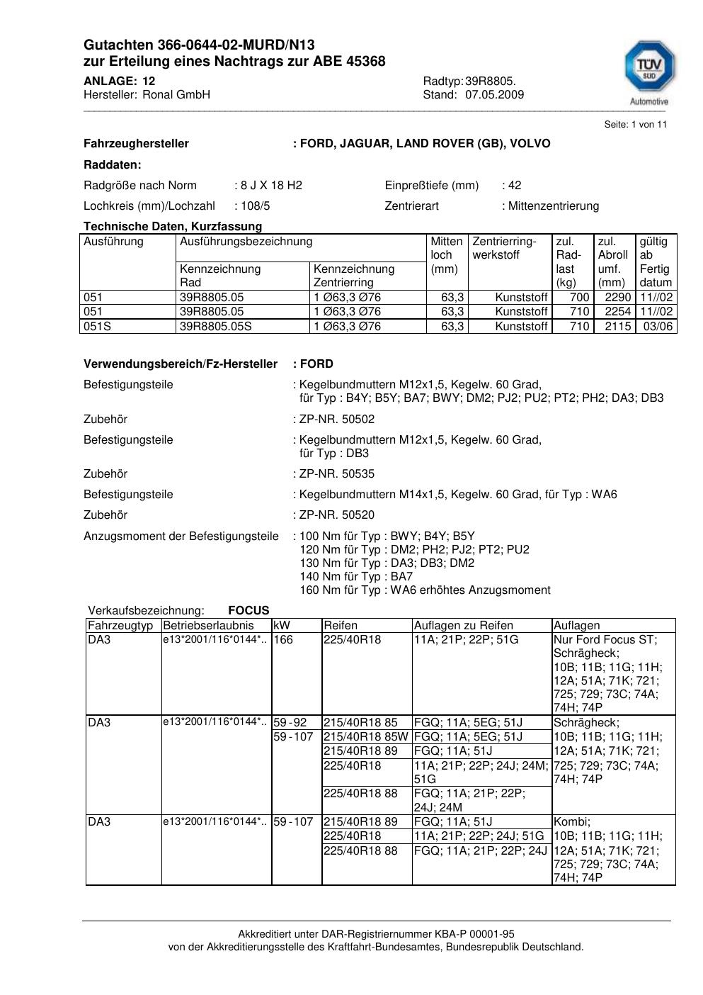 Dieses Gutachten (abe) bezieht sich auf die Alufelge Ronal 39R8805 in der Ausführung 8Jx18 ET 0, Mittenloch 0 mm (KBA 45368). Im PDF findest du typischerweise zulässige Reifengrößen, Auflagen/Anbauhinweise und – je nach Dokument – Hinweise zur Eintragung.