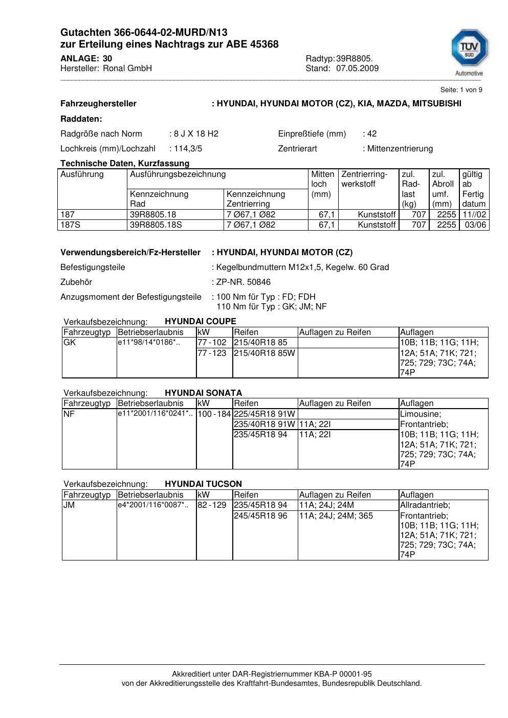 Dieses Gutachten (abe) bezieht sich auf die Alufelge Ronal 39R8805 in der Ausführung 8Jx18 ET 0, Mittenloch 0 mm (KBA 45368). Im PDF findest du typischerweise zulässige Reifengrößen, Auflagen/Anbauhinweise und – je nach Dokument – Hinweise zur Eintragung.