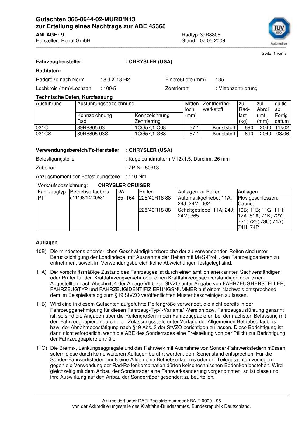 Dieses Gutachten (abe) bezieht sich auf die Alufelge Ronal 39R8805 in der Ausführung 8Jx18 ET 0, Mittenloch 0 mm (KBA 45368). Im PDF findest du typischerweise zulässige Reifengrößen, Auflagen/Anbauhinweise und – je nach Dokument – Hinweise zur Eintragung.