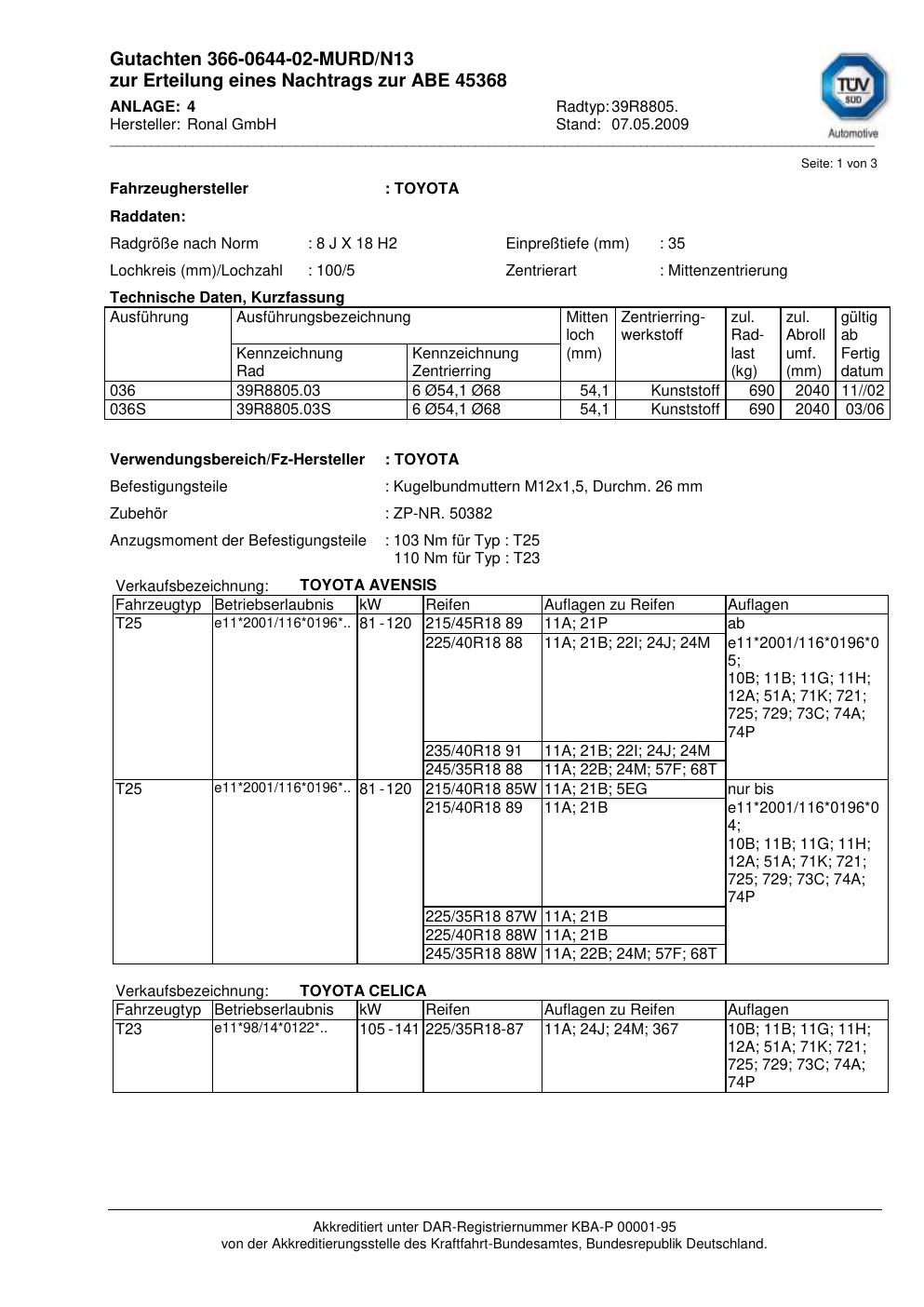 Dieses Gutachten (abe) bezieht sich auf die Alufelge Ronal 39R8805 in der Ausführung 8Jx18 ET 0, Mittenloch 0 mm (KBA 45368). Im PDF findest du typischerweise zulässige Reifengrößen, Auflagen/Anbauhinweise und – je nach Dokument – Hinweise zur Eintragung.