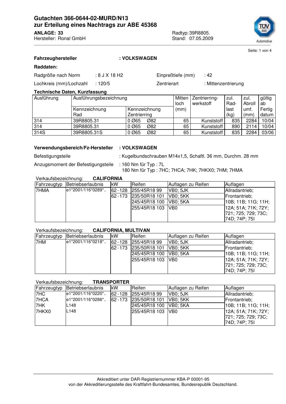 Dieses Gutachten (abe) bezieht sich auf die Alufelge Ronal 39R8805 in der Ausführung 8Jx18 ET 0, Mittenloch 0 mm (KBA 45368). Im PDF findest du typischerweise zulässige Reifengrößen, Auflagen/Anbauhinweise und – je nach Dokument – Hinweise zur Eintragung.