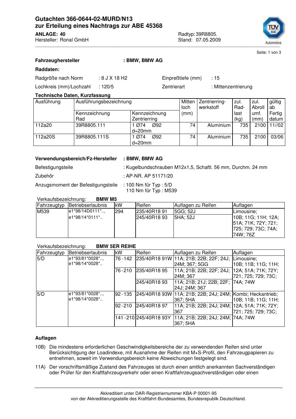 Dieses Gutachten (abe) bezieht sich auf die Alufelge brand-ronal 39R8805 in der Ausführung 8Jx18 ET 0, Mittenloch 0 mm (KBA 45368). Im PDF findest du typischerweise zulässige Reifengrößen, Auflagen/Anbauhinweise und – je nach Dokument – Hinweise zur Eintragung.