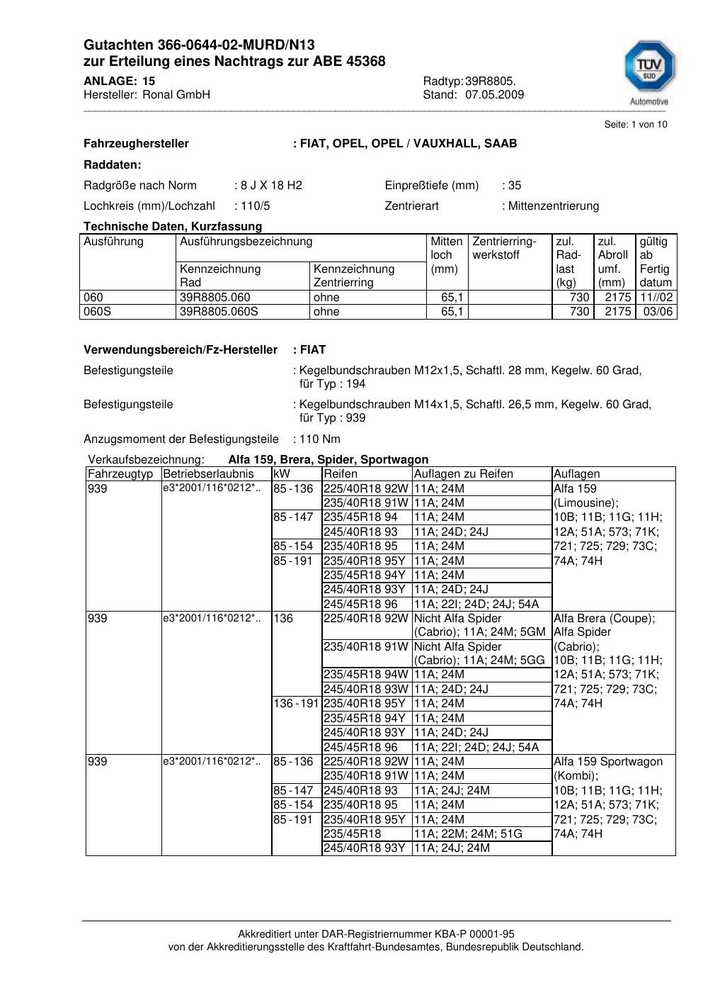 Dieses Gutachten (abe) bezieht sich auf die Alufelge brand-ronal 39R8805 in der Ausführung 8Jx18 ET 0, Mittenloch 0 mm (KBA 45368). Im PDF findest du typischerweise zulässige Reifengrößen, Auflagen/Anbauhinweise und – je nach Dokument – Hinweise zur Eintragung.