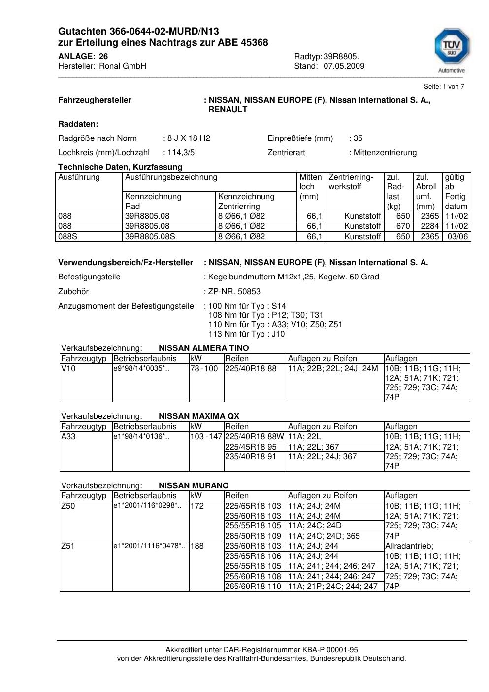 Dieses Gutachten (abe) bezieht sich auf die Alufelge Ronal 39R8805 in der Ausführung 8Jx18 ET 0, Mittenloch 0 mm (KBA 45368). Im PDF findest du typischerweise zulässige Reifengrößen, Auflagen/Anbauhinweise und – je nach Dokument – Hinweise zur Eintragung.