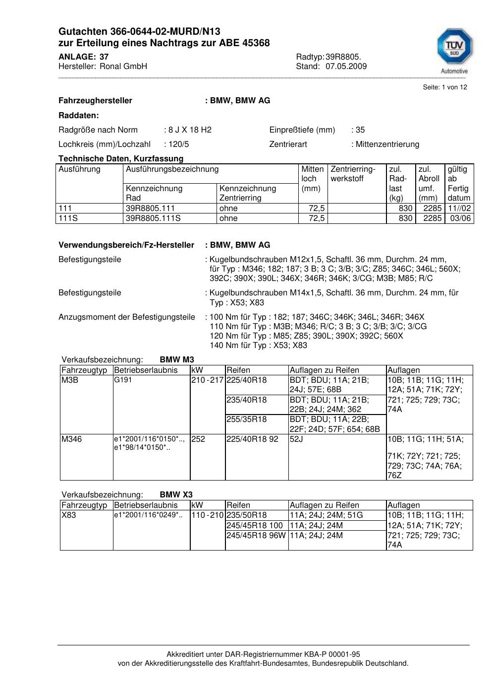 Dieses Gutachten (abe) bezieht sich auf die Alufelge Ronal 39R8805 in der Ausführung 8Jx18 ET 0, Mittenloch 0 mm (KBA 45368). Im PDF findest du typischerweise zulässige Reifengrößen, Auflagen/Anbauhinweise und – je nach Dokument – Hinweise zur Eintragung.