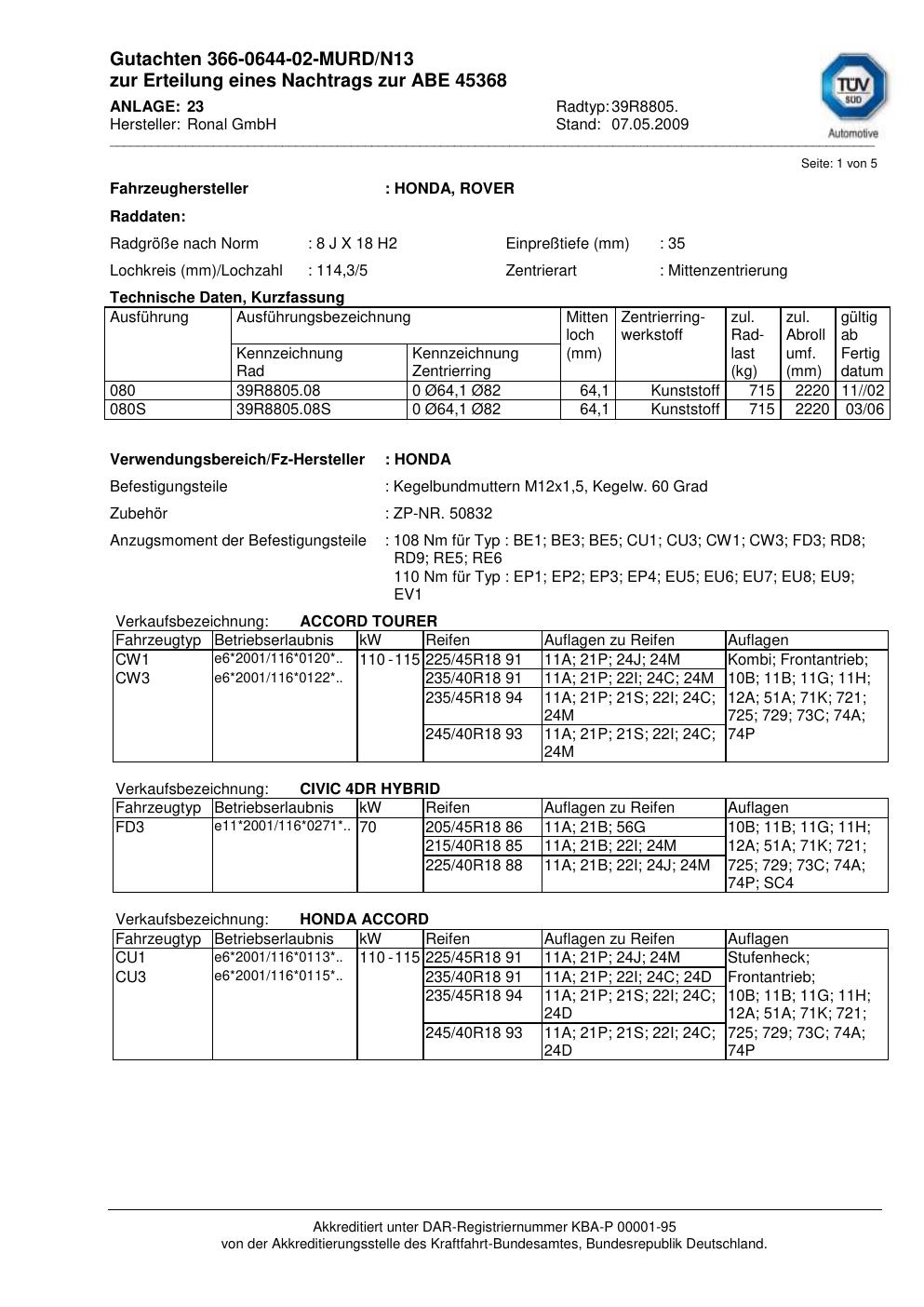 Dieses Gutachten (abe) bezieht sich auf die Alufelge brand-ronal 39R8805 in der Ausführung 8Jx18 ET 0, Mittenloch 0 mm (KBA 45368). Im PDF findest du typischerweise zulässige Reifengrößen, Auflagen/Anbauhinweise und – je nach Dokument – Hinweise zur Eintragung.