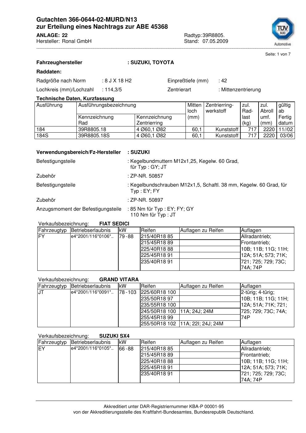 Dieses Gutachten (abe) bezieht sich auf die Alufelge Ronal 39R8805 in der Ausführung 8Jx18 ET 0, Mittenloch 0 mm (KBA 45368). Im PDF findest du typischerweise zulässige Reifengrößen, Auflagen/Anbauhinweise und – je nach Dokument – Hinweise zur Eintragung.