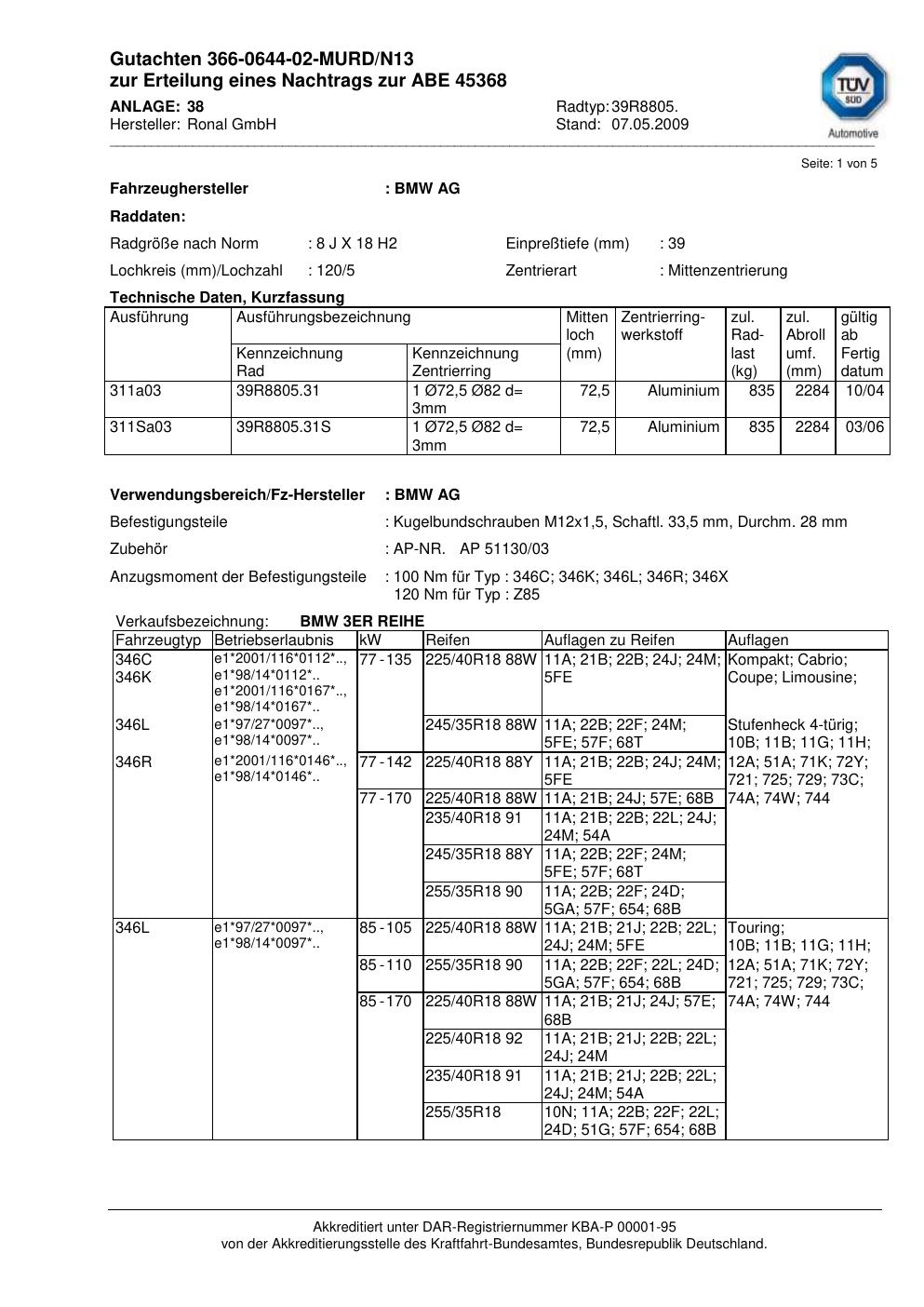 Dieses Gutachten (abe) bezieht sich auf die Alufelge brand-ronal 39R8805 in der Ausführung 8Jx18 ET 0, Mittenloch 0 mm (KBA 45368). Im PDF findest du typischerweise zulässige Reifengrößen, Auflagen/Anbauhinweise und – je nach Dokument – Hinweise zur Eintragung.